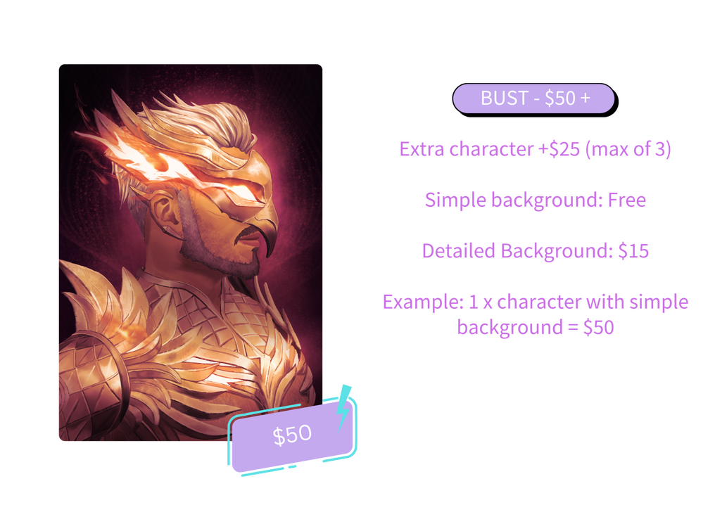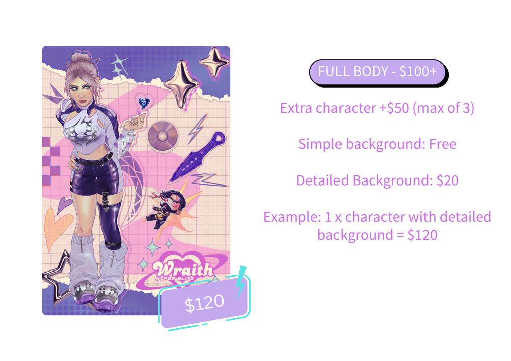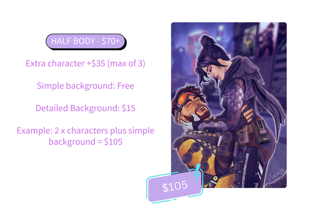 Please see below my indicative prices. All my commissions are fully rendered pieces.As a developing artist, I take on commissions that align with my interests and where I feel confident I can create something you'll love! I don't have any hard and fast "will not draws" (besides 18+) so please feel free to reach out with your idea.I particularly like drawing Apex Legends characters and skins / outfits with lots of details. If you want something for your favourite character or ship similar to what you can see in my gallery, I'd love to hear from you!Single colour, gradient or blurred backgrounds are free. Detailed backgrounds are anything that require drawn elements and incur an additional charge.Please provide a good amount of detail when contacting me. Visual reference very much preferred! In depth details regarding pose, expression, clothing etc is super appreciated. The more guidance you can provide, the closer I can get to what you have in mind :D